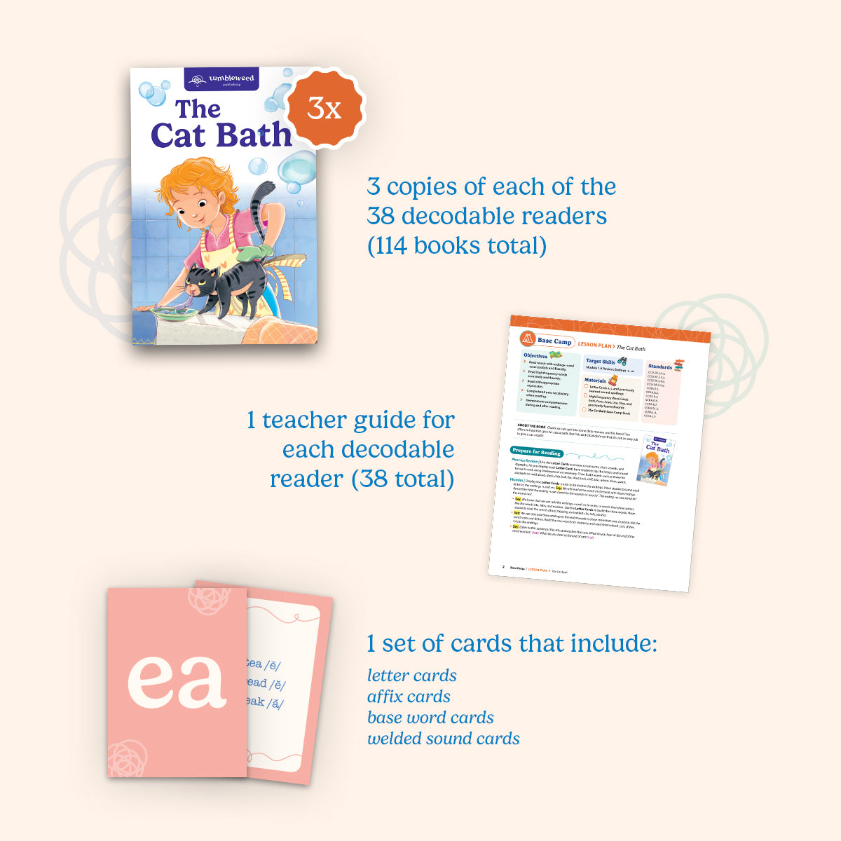 - 3 copies of each of the 38 decodable readers Base Camp Series (114 books total)